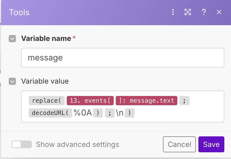 {{replace(13.events[].message.text; decodeURL(“%0A”); “\n”)}}
